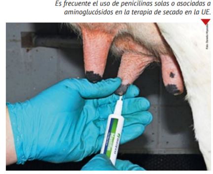 El tratamiento intramamario de vacas lecheras para la prevención y / o tratamiento de infecciones de ubre durante el período seco es común en la UE y en el mundo entero, principalmente con penicilinas, solas o en combinación con aminoglucósidos, o cefalosporinas de primera y segunda generación. En algunas mastitis sub clínicas, las cefalosporinas de tercera y cuarta generación también se usan con mucha frecuencia, pero su utilización es cuestionable. Los resultados de la literatura científica sobre el tiempo necesario entre el tratamiento con antibiótico al inicio del periodo de secado y el parto indicaron que los niveles de residuos antimicrobianos en las muestras de calostro son bajos. Solo dos estudios presentaron resultados sobre los niveles de residuos antimicrobianos en muestras de calostro de campo que muestran un bajo número de muestras con niveles por encima de los niveles máximos de residuos (LMR) o el límite de detección. La alimentación de terneros con calostro de vacas lecheras tratadas con antimicrobianos al comienzo del período seco es una práctica común en la mayoría de los predios lecheros de la UE y el mundo. Un estudio mostró que la alimentación de terneros con calostro de vacas tratadas con penicilinas y aminoglucósidos al comienzo del período seco no aumenta el desprendimiento fecal de Escherichia coli resistente a los antimicrobianos en dichos terneros.